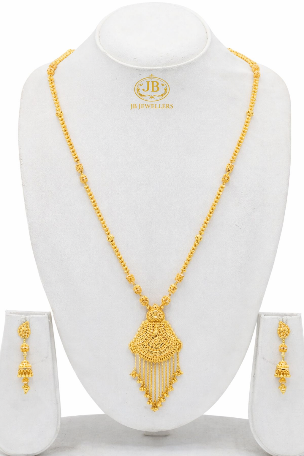 Presenting this graceful gold necklace set from JB Jewellers, crafted with fine detailing and classic elegance. The necklace features a delicate gold bead chain that leads to a beautifully designed ornamental pendant with elegant hanging chains, creating a sophisticated and eye-catching look.