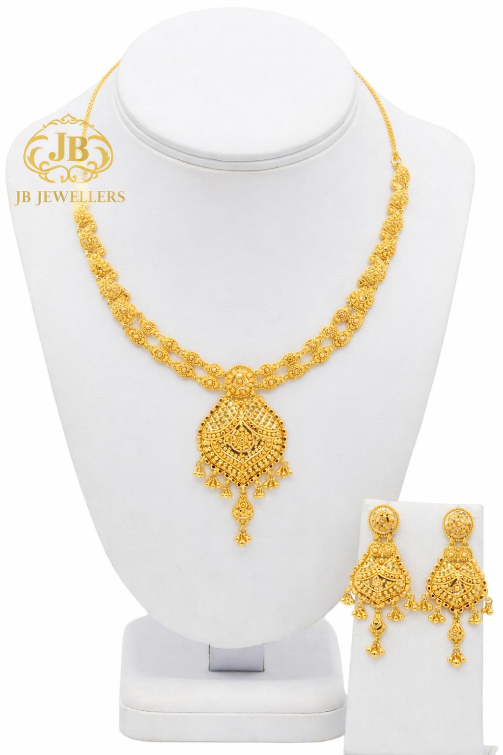 Introducing this beautiful traditional gold jewellery set from JB Jewellers, featuring an elegant necklace paired with perfectly matching earrings. The necklace is designed with intricate detailing along the chain and a stunning ornamental pendant that creates a graceful focal point.