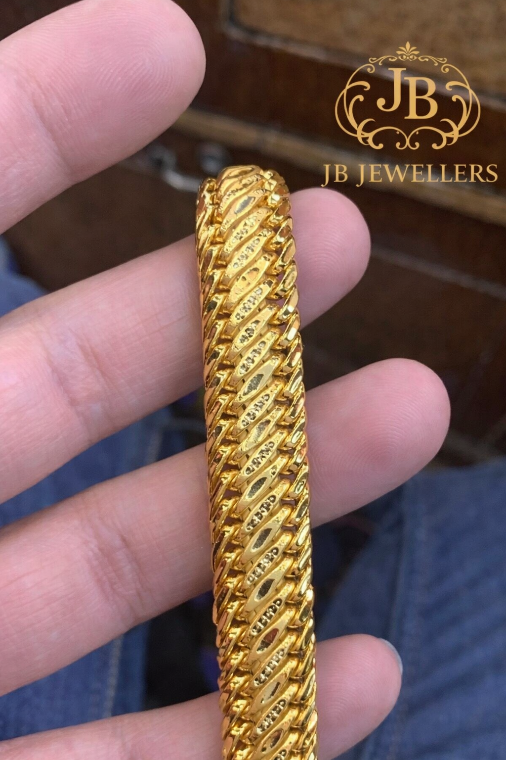Presenting the Premium Heavy Designer Gold Bracelet from JB Jewellers, designed for those who appreciate bold craftsmanship and luxurious style. This bracelet features an intricate woven pattern with a thick and solid structure, giving it a powerful and elegant look.