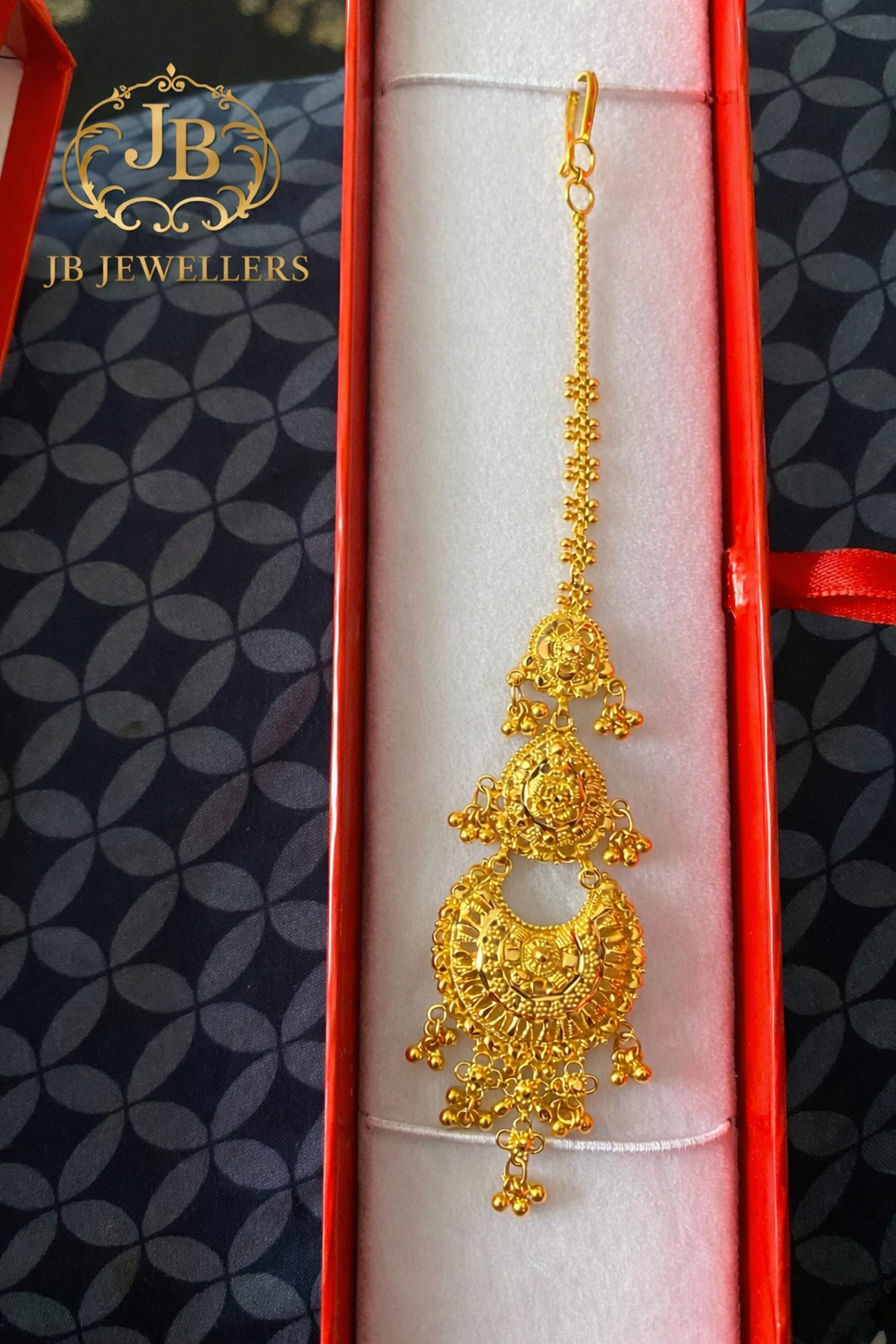 Introducing the Traditional Gold Maang Tikka from JB Jewellers, designed to add royal elegance to your bridal and festive look. This exquisite piece features detailed craftsmanship with delicate hanging elements that create a graceful and eye-catching design.
