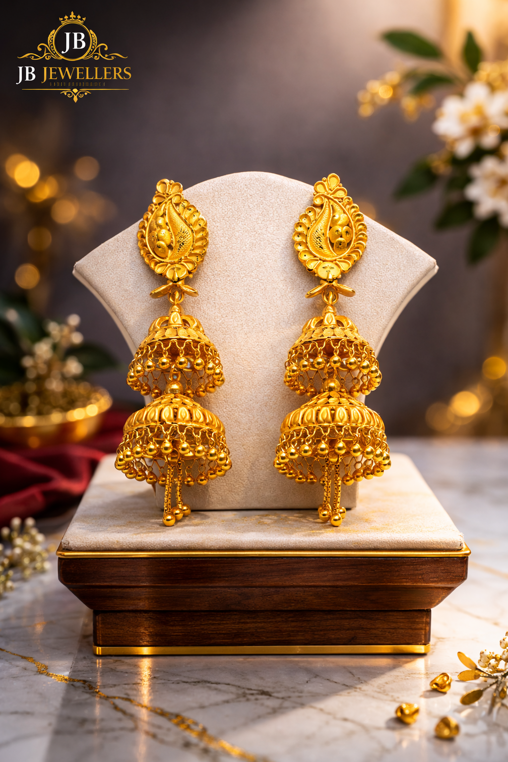 Add a touch of regal charm to your jewelry collection with these exquisite 18K gold peacock double jhumka earrings from JB Jewellers. The design features a beautifully detailed peacock-inspired stud, symbolizing grace and heritage, which flows into a stunning two-tier jhumka structure.