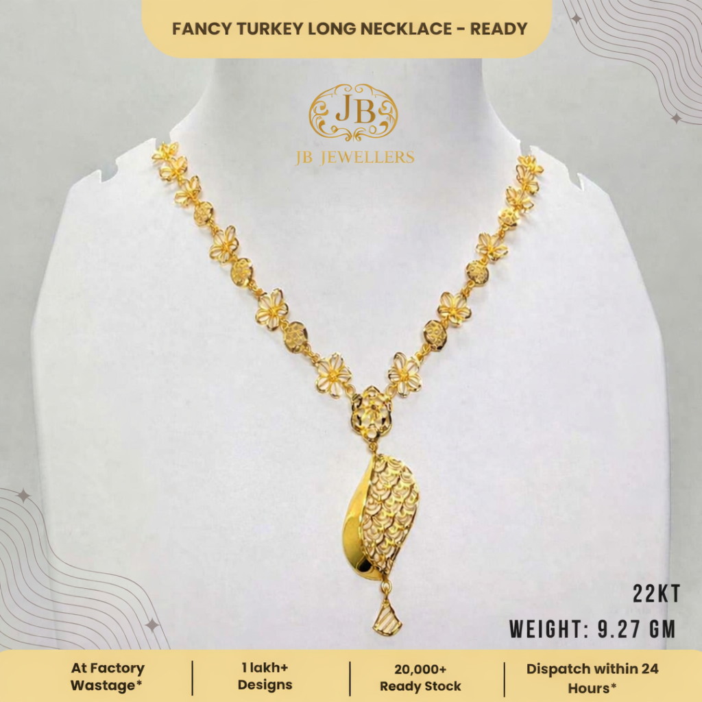 Elevate your jewellery collection with this beautifully crafted 22KT Fancy Turkey Long Necklace, designed to reflect timeless elegance and intricate artistry. Weighing 9.27 grams, this lightweight yet luxurious piece showcases finely detailed floral motifs connected with textured gold beads, leading to a striking peacock-inspired long pendant.