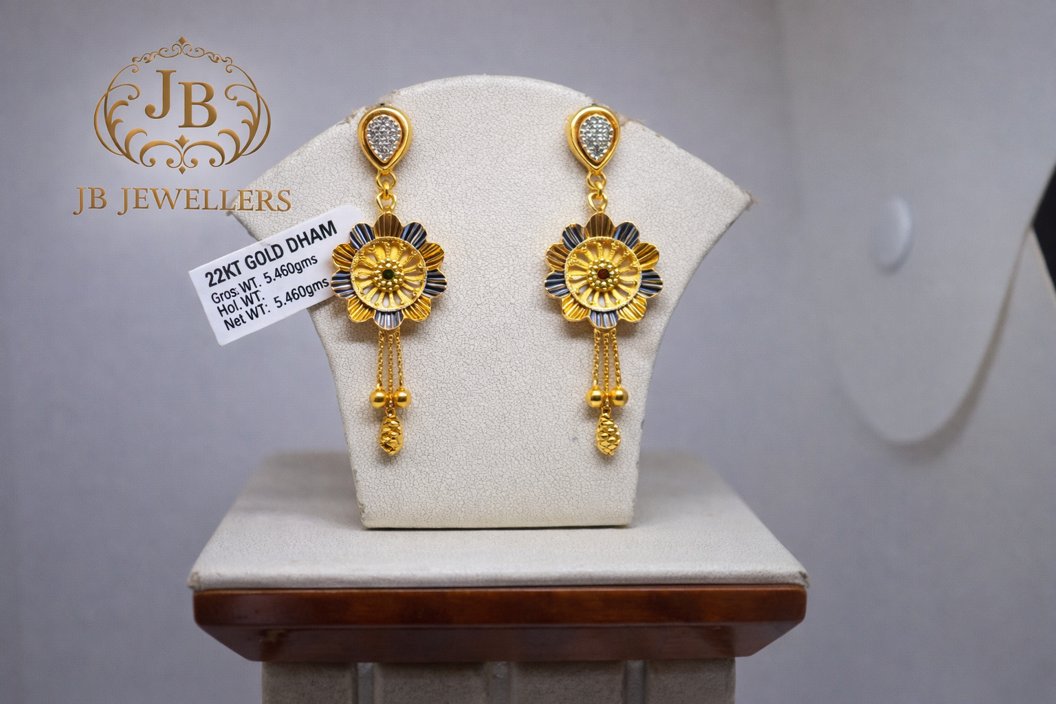 Enhance your jewellery collection with these beautifully crafted 22KT gold floral drop earrings. Designed with a striking flower motif, the earrings showcase a detailed petal pattern with subtle dual-tone accents that add depth and elegance. The intricate center detailing is complemented by delicate dangling gold beads that provide graceful movement and sparkle.