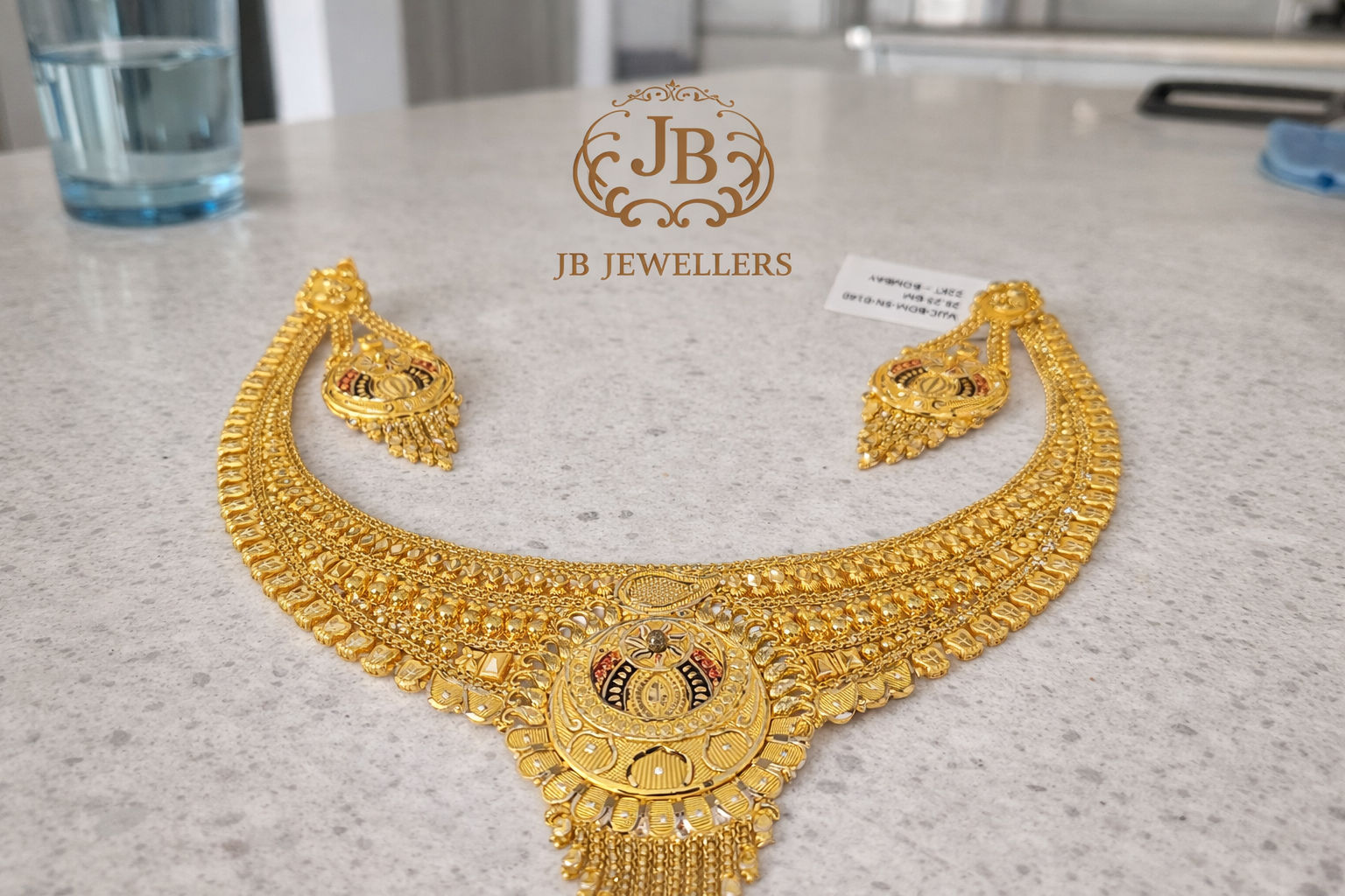 Presenting a magnificent 22KT gold necklace set that reflects timeless temple-inspired artistry and royal craftsmanship. Designed with layered gold bead detailing, intricate patterned links, and a bold circular centerpiece, this set embodies heritage elegance with a luxurious finish.