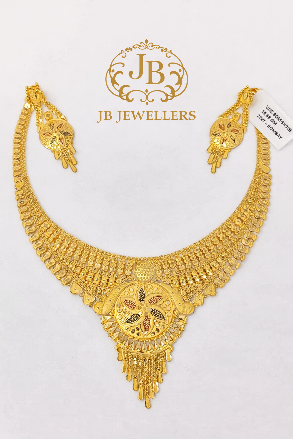 Elevate your ethnic look with this exquisite 22KT gold necklace set from JB Jewellers. Designed with intricate craftsmanship, the necklace features layered detailing with finely textured gold elements and a stunning floral centerpiece accented with delicate enamel work. The elegant dangling tassels add graceful movement, enhancing its royal appeal.