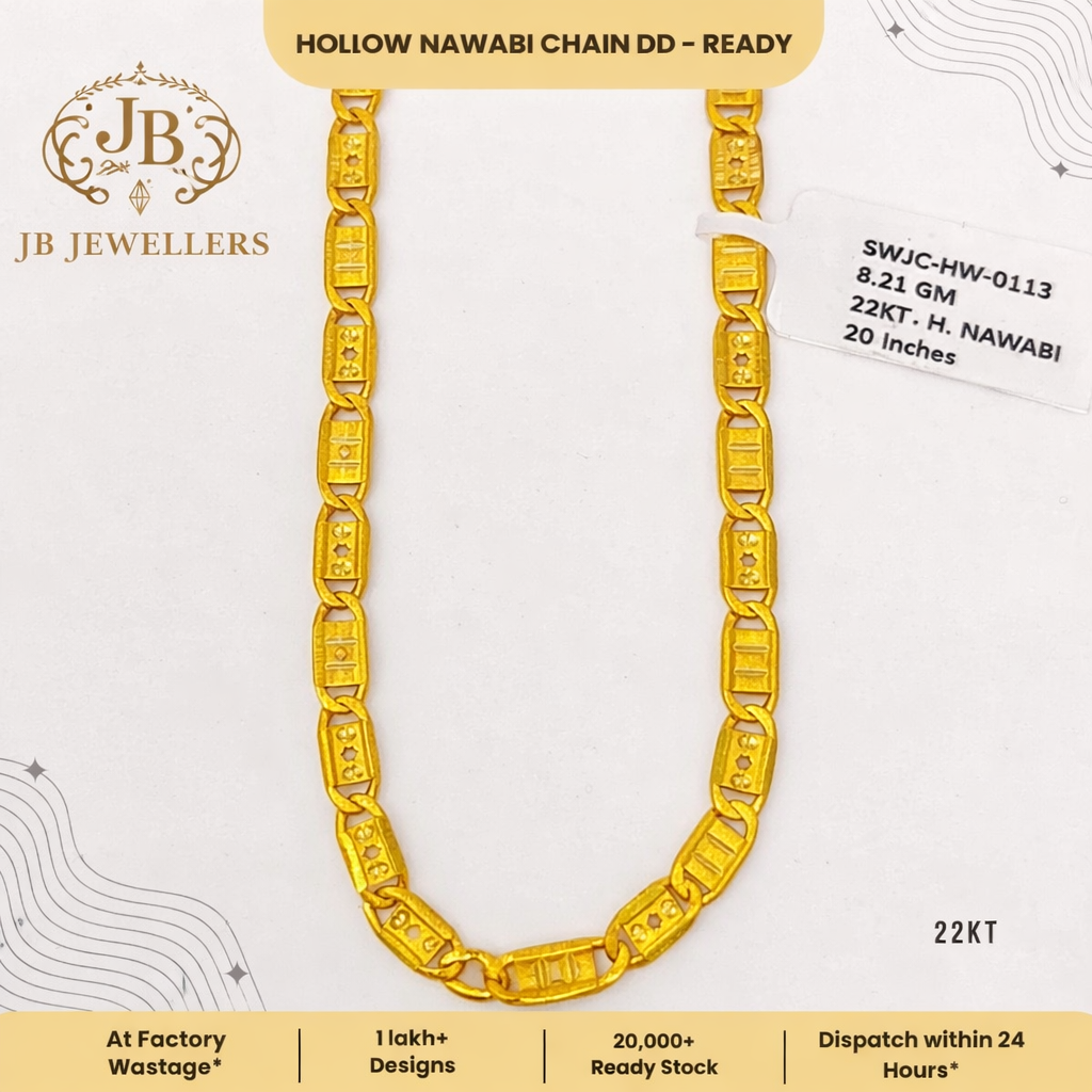 Add a touch of royal elegance to your collection with this 22KT Hollow Nawabi Chain DD, crafted with intricate rectangular links and fine engraved detailing. Designed for a premium yet lightweight feel, this 20-inch chain offers both comfort and sophistication, making it ideal for daily wear as well as special occasions. Its rich gold finish and classic Nawabi design reflect timeless craftsmanship, while the hollow construction ensures ease of wear without compromising on style. A perfect choice for customers looking for a trendy, ready-stock gold chain with factory wastage benefits and quick dispatch.