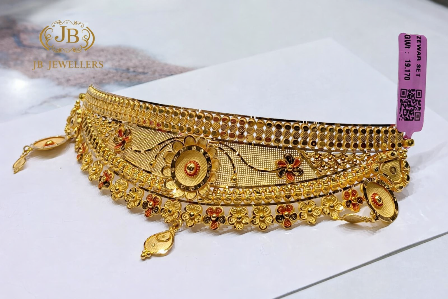 Make a royal impression with this stunning 22KT gold traditional choker, beautifully designed with intricate detailing and layered craftsmanship. The piece features elegant floral motifs, textured mesh work, and delicate gold danglings that add graceful movement and richness to the design.