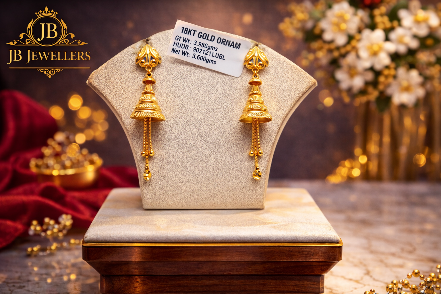 Elevate your style with these beautifully designed 18K gold drop earrings, featuring a refined top with subtle detailing that flows into a classic bell-shaped motif. The layered texture adds depth and richness, while the fine chain drops with bead accents bring graceful movement and shine. Perfectly blending traditional inspiration with modern sophistication, these earrings are ideal for festive occasions, weddings, or elegant everyday wear. Lightweight yet striking, they are a perfect addition to any jewelry collection that values craftsmanship and timeless beauty.