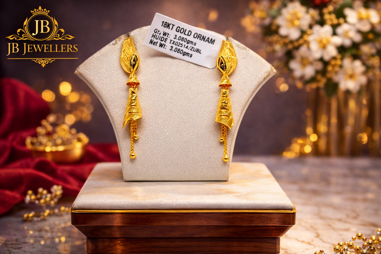 Add a touch of refined elegance to your jewelry collection with these beautifully designed 18K gold drop earrings. Featuring a stylish teardrop-shaped stud that flows into a uniquely textured cone design, these earrings highlight intricate craftsmanship and contemporary appeal. The delicate dangling chains with bead accents enhance movement and sophistication, making them perfect for both everyday wear and special occasions. Lightweight and versatile, this pair blends modern design with timeless gold brilliance, making it an ideal choice for effortless elegance.