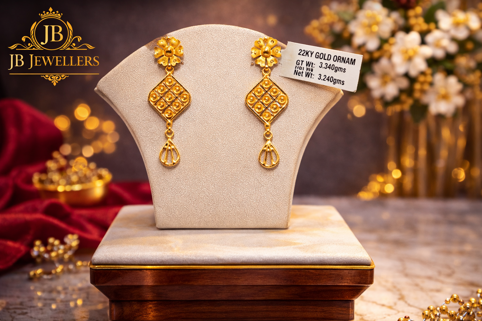 Enhance your elegance with these beautifully crafted 22K gold drop earrings. Featuring a charming floral stud design that flows into a finely detailed diamond-shaped centerpiece, these earrings showcase exceptional craftsmanship and intricate gold beadwork. The subtle dangling element adds movement and sophistication, making them perfect for both traditional occasions and modern styling. Lightweight yet eye-catching, this pair is ideal for festive wear, weddings, or everyday luxury, reflecting timeless beauty and refined taste.