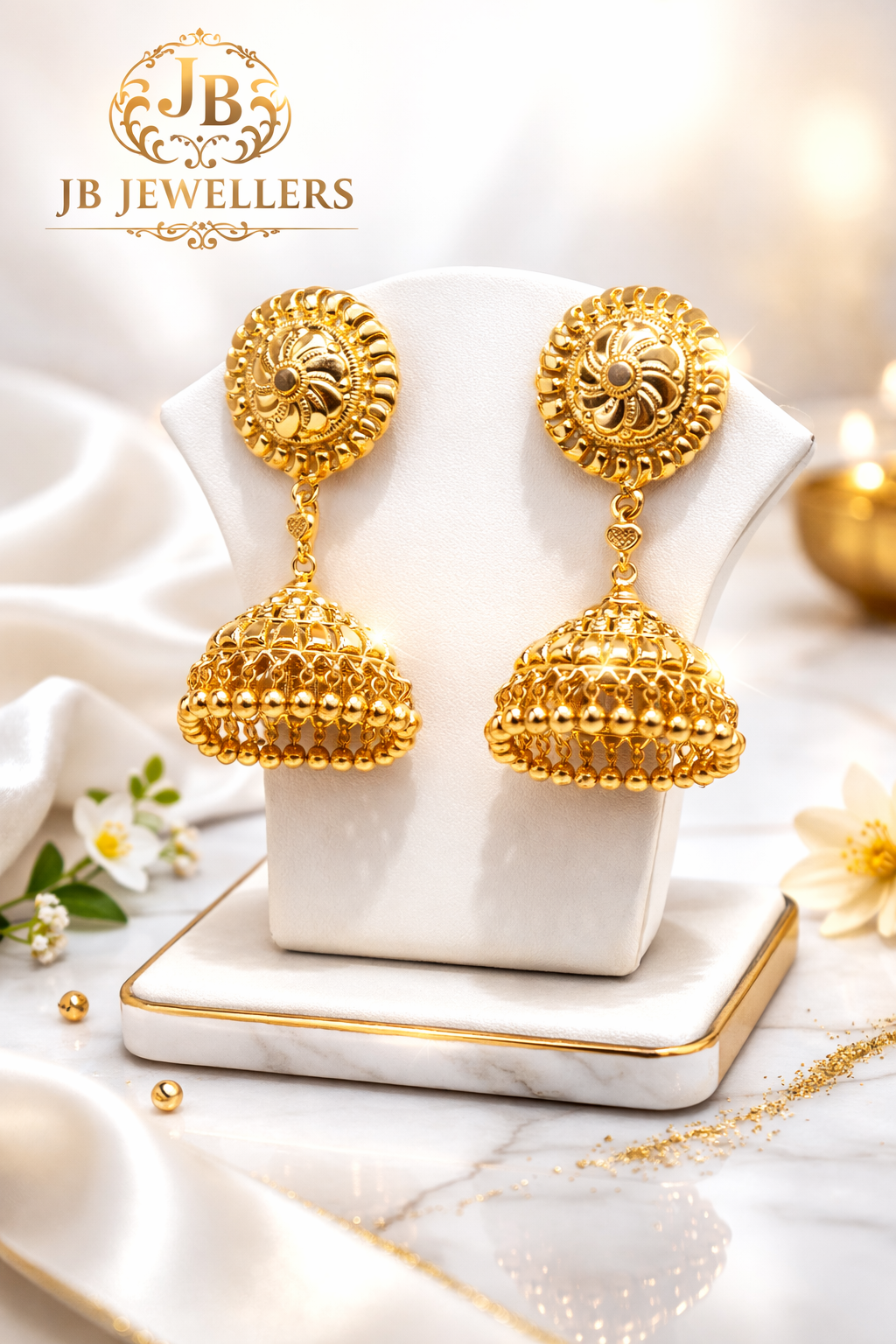 Add a touch of royal elegance to your jewellery collection with these beautifully crafted traditional gold jhumka earrings from JB Jewellers. Designed with intricate detailing and a classic dome-shaped drop, these earrings showcase fine craftsmanship and timeless Indian heritage style.