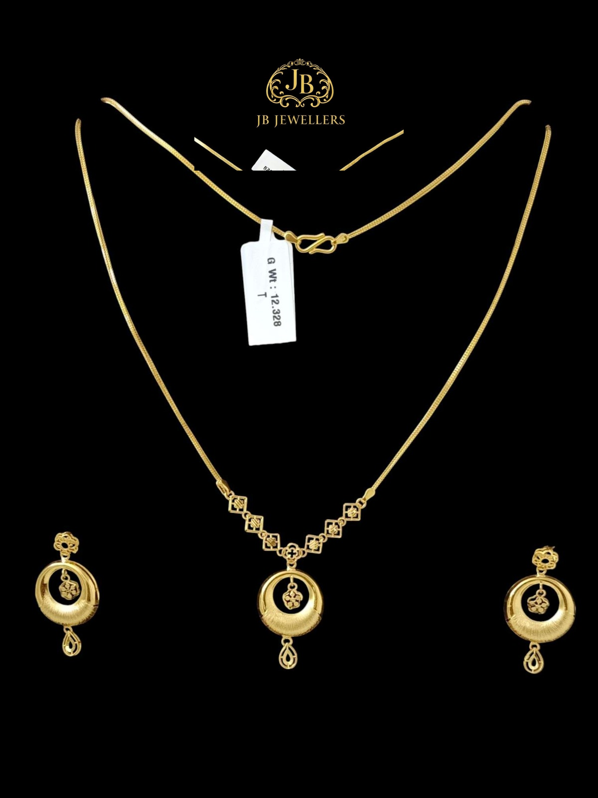 This elegant gold necklace set features a beautifully crafted circular pendant with delicate geometric detailing along the chain, paired with matching drop earrings. The balanced design offers a sophisticated and traditional look, making it suitable for festive events, family functions, or daily wear. Lightweight and stylish, this set is a perfect addition to any jewellery collection and an excellent gifting choice.