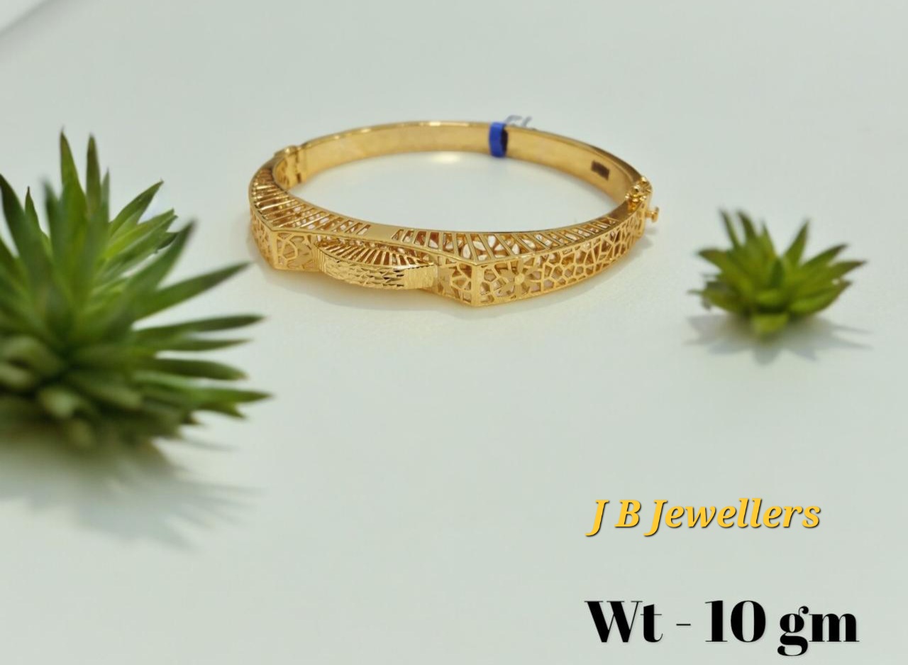 Adorn yourself with this enduring 22 karat yellow gold bangle, featuring filigree craftsmanship and intricate rawa work in a half and half style.