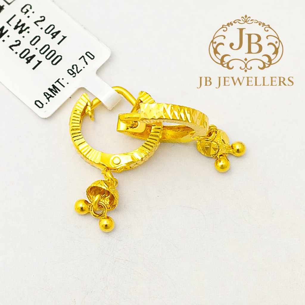 These 22KT gold designer hoop ear tops feature a beautifully textured finish and elegant hanging bead charms that add subtle movement and shine. Crafted for comfort and everyday style, the lightweight design makes them ideal for daily wear while still offering a refined traditional touch. A versatile addition to any jewellery collection, perfect for casual occasions, gifting, or regular use.