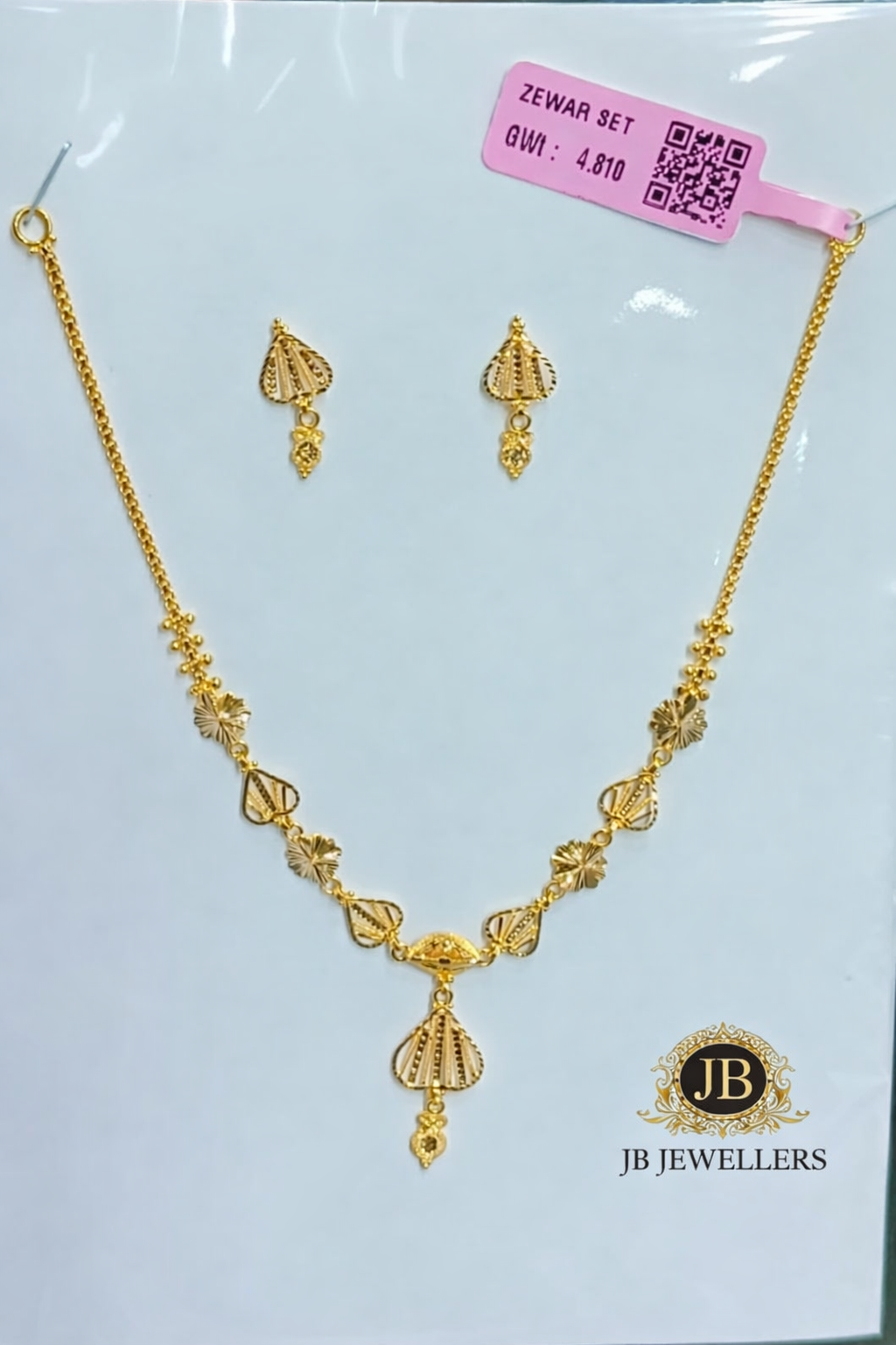 This elegant gold Zewar Set from JB Jewellers features a delicate chain design with floral and shell-inspired motifs, finished with a graceful hanging pendant. The matching drop earrings complete the look, adding subtle sparkle and balance.
