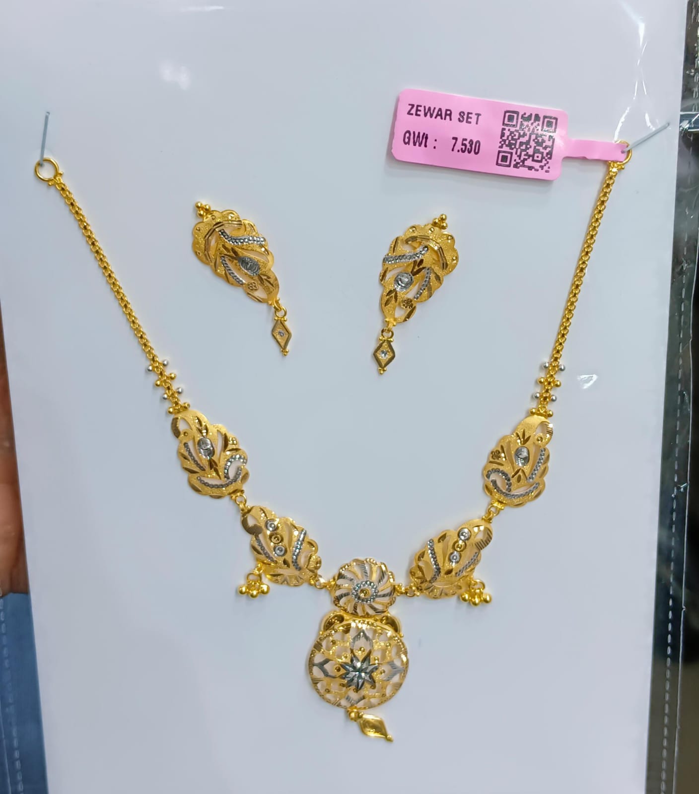 Enhance your ethnic look with this beautifully crafted JB Royal Pushp Zewar Set. Designed with intricate floral and leaf patterns, this set features a stunning central pendant with delicate detailing and matching earrings that add charm and sophistication.
